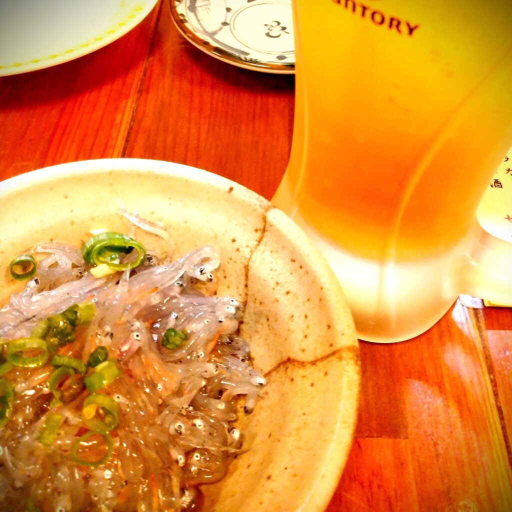 金曜日の夜ということもあり、店内は奥の座敷も含めて満席。奇跡的に? カウンター席が1つだけ空いていたのでそこに案内されました。対応してくれたのは東南アジア系と思しき外国人の女性。日本に来てからまだそこまで経っていないのか、若干怪しげな日本語。とはいえ基本、メニューがあるので問題ないだろうとテキトーに聞き流し、とりあえずビール。お通しの生しらすは「こんなもんか」という感じで、それからマグロの刺身、枝豆を注文。後で思ったんですけど、沼津まで行って僕はなんで枝豆を頼んじゃったんでしょうね? 枝豆といったら地元が日本一だってわかってるのに。