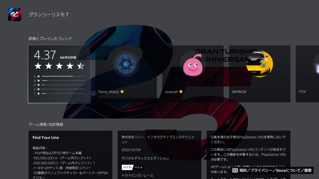 とまぁ ここまで文句ばっかり言ってきましたけど、発売から3年半以上経っていまだにアプデされ続けるのは素晴らしいとしか言いようがなく。PS Storeの平均評価が「4.37」。ぱっと見で8割以上のユーザーが★5を付けてるようです。そもそもこの手のゲームで、シリーズ7作目(間にプロローグとかあったから実際はもっと多い)で売り上げが一番多いっていう時点で異常。世間的にはものすごく高評価なゲーム。それがGT7。