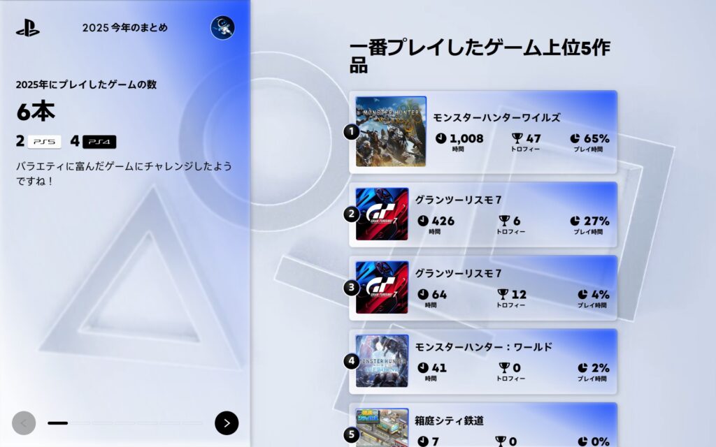 毎年恒例「あなたのPlayStation 2025」によると、2025年に最もプレイしたゲームはやはりモンハンワイルズ。2位のGT7にダブルスコアの圧勝でした。ちなみに画像の通り、GT7が2つ表示されているのはPS5とPS4で別々に集計されているからだと思われ。長期休暇で帰省したときなどはPS4を使うことが多かったですからね(PS5を持って行くこともあった)